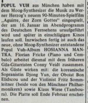 Popul Vuh aus München haben mit dem Moog-Synthesizer die Musik zu Werner Herzog’s neuem 90-Minuten-Spielfilm „Aguirre, der Zorn Gottes“ eingespielt, der am 16.Januar im Abendprogramm des Deutschen Fernsehens uraufgeführt wird und später in einschlägigen Kinos laufen soll. Inzwischen fertig ist auch das neue, ohne Moog-Synthesizer entstandene Popul Vuh-Album HOSIANNA MANTRA. Florian Fricke (Piano und Cembalo) arbeitet diesmal mit dem früheren Gila-Gitarristen Conny Veidt zusammen. Als Gäste wirken mit: die koreanische Sopranistin Djong Yun, der Oboist Bon Elidscou und der Viollinist Fritz Sommleitner (beide von den Münchner Philharmonikern) sowie Klaus Wiese (Tamboura). Die Platte soll Ende Februar erscheinen.