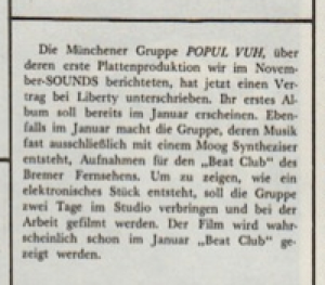Die Münchener Gruppe POPUL VUH, über deren erste Plattenproduktion wir im November-SOUNDS berichteten, hat jetzt einen Vertrag bei Liberty unterschrieben. Ihr erstes Album soll bereits im Januar erscheinen. Ebenfalls im Januar macht die Gruppe, deren Musik fast ausschliesslich mit einem Moog Synthesizer entsteht, Aufnahmen für den „Beat Club“ des Bremer Fernsehens. Um zu zeigen, wie ein elektronisches Stück entsteht, soll die Gruppe zwei Tage im Studio verbringen und bei der Arbeit gefilmt werden. Der Film wird wahrscheinlich schon im Januar „Beat Club“ gezeigt.