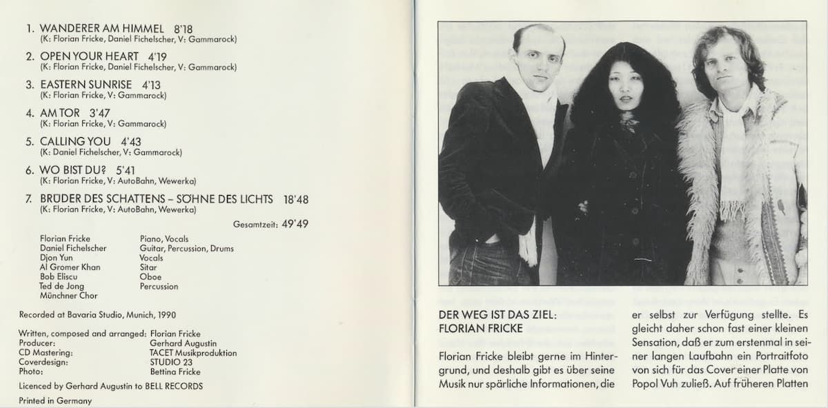 On this CD we have put together some of the stops which Florian Fricke has made with Popol Vuh along this path. Most of the recordings have not been released before, and together they aim to help the listener to see a clearly outlined portrait of this unusual musician - just as he is portrayed on the cover and in the original quotations in the following text.