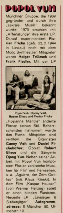 Popol Vuh, Florian Frickes Münchner Musikgrppe, hat in wechselnden Besetzungen eine ganze Reihe Schallplatten mit einer sehr schönen, sanften, friedlichen Meditationsmusik produziert, Platten von höchster Studiopräzision, denen man die Arbeit wie die spontane Freude am Musizieren gleichermaßen anhören konnte. Diese Musik war bis vor einiger Zeit geprägt von der sehr instrumental gehandhabten Elektronik des Moog Synthesizer, was sehr schnell dazu geführt hatt, daß die Musik von Popol Vuh in den großen Topf geworfen wurde, in dem die Plattenproduzenten einen neue deutsche Mode mit dem Titel Kosmische Musik zusammenbrauten. Florian Fricke schaffte den Rückzug, indem er den Synthesizer aufgab und zum Flügel zurïckkehrte. “Hosiannna Mantra, die erste Platte der neuen Besetzung, wurde dann eine der schönsten des vergangenen Jahres.