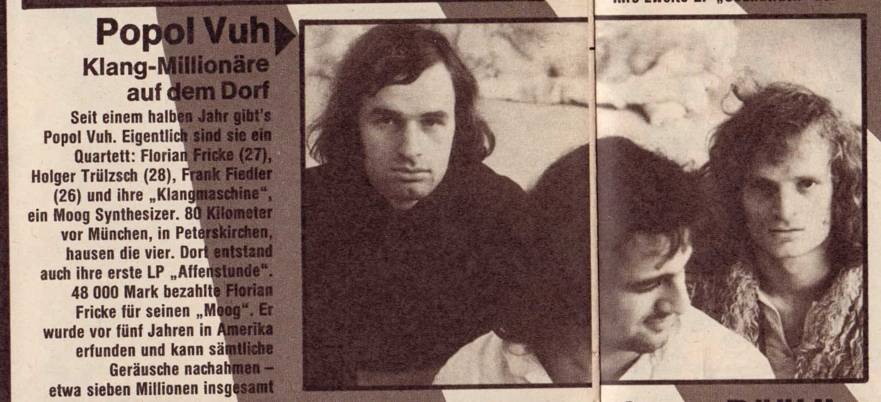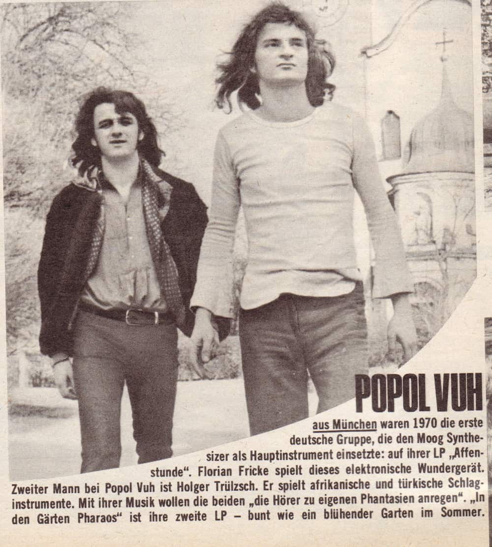 POPUL VUH ist eine Musikgruppe, die mit dem Moog-Synthesizer arbeitet, einem elektronischen Musikinstrument gigantischen Ausmasses. Seit etwa 5 Jahren geistert die Moogmaschine in der Musikszene bizarr und nachäffend herum; wir haben gehört: Es fuhren Motorräder in einem Froschteich, Musik von Bach oder erfolgreiche Rockmusik wurden elektronisch reproduziert. Dinge, die wir schon gehört hatten, haben wir noch einmal gehört,mehr nicht.