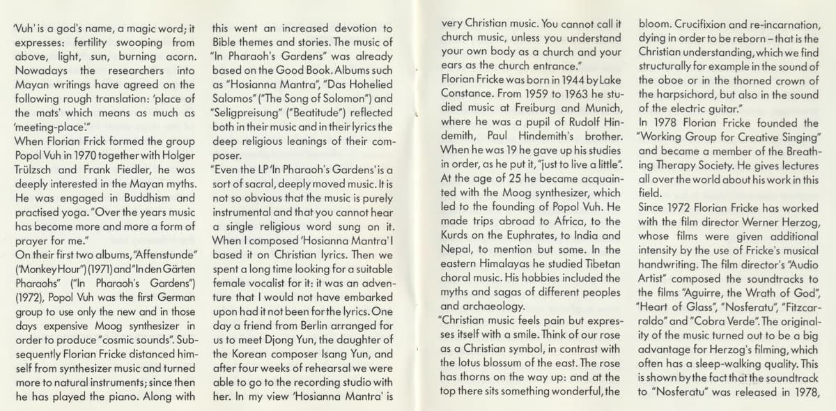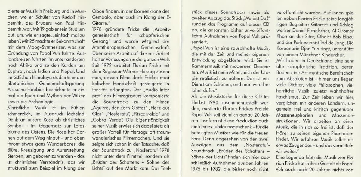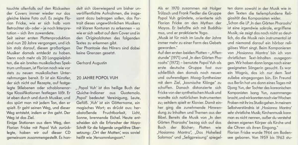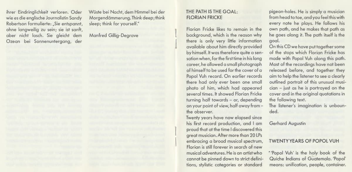 On this CD we have put together some of the stops which Florian Fricke has made with Popol Vuh along this path. Most of the recordings have not been released before, and together they aim to help the listener to see a clearly outlined portrait of this unusual musician - just as he is portrayed on the cover and in the original quotations in the following text.