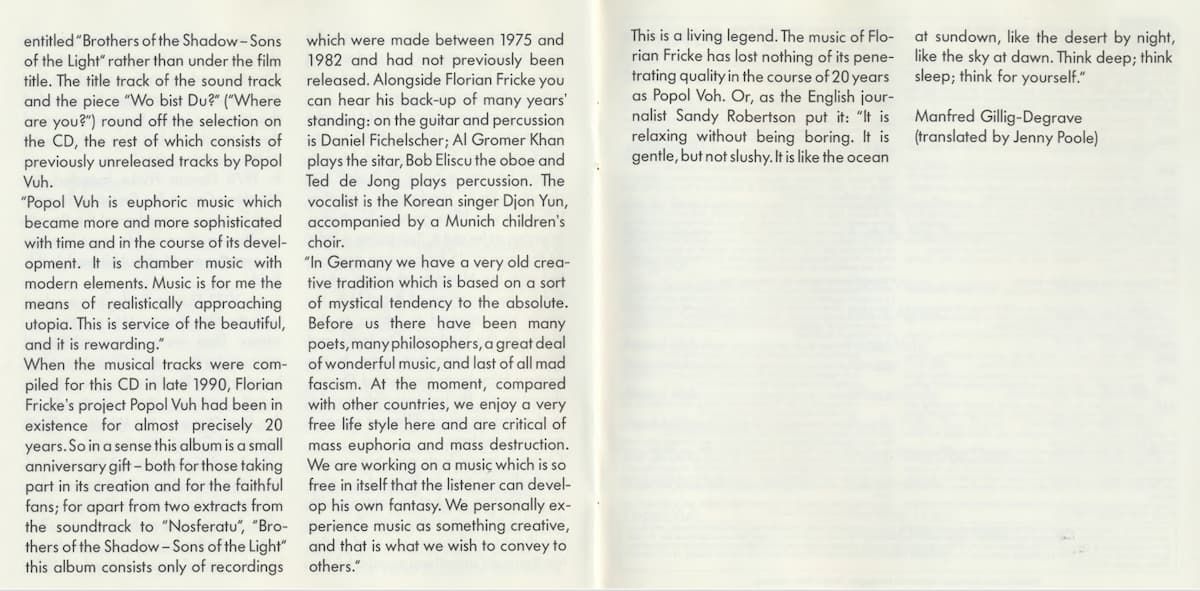 When the musical tracks were compiled for this CD in late 1990, Florian Fricke's project Popol Vuh had been in existence for almost 20 years. So in a sense this album is a small anniversary gift - both for those taking part in its creation and for the faithful fans; for apart from two extracts from the soundtrack to "Nosferatu", "Brothers of the Shadow - Sons of the Light" this album consists only of recordings which were made between 1975 and 1982 and had not previously been released. Alongside Florian Fricke you can hear his back-up of many years' standing: on the guitar and percussion is Daniel Fichelscher; Al Gromer Khan plays the sitar, Bob Eliscu the oboe and Ted de Jong plays percussion. The vocalist is the Korean singer Djong Yun, accompanied by a Munich children's choir.